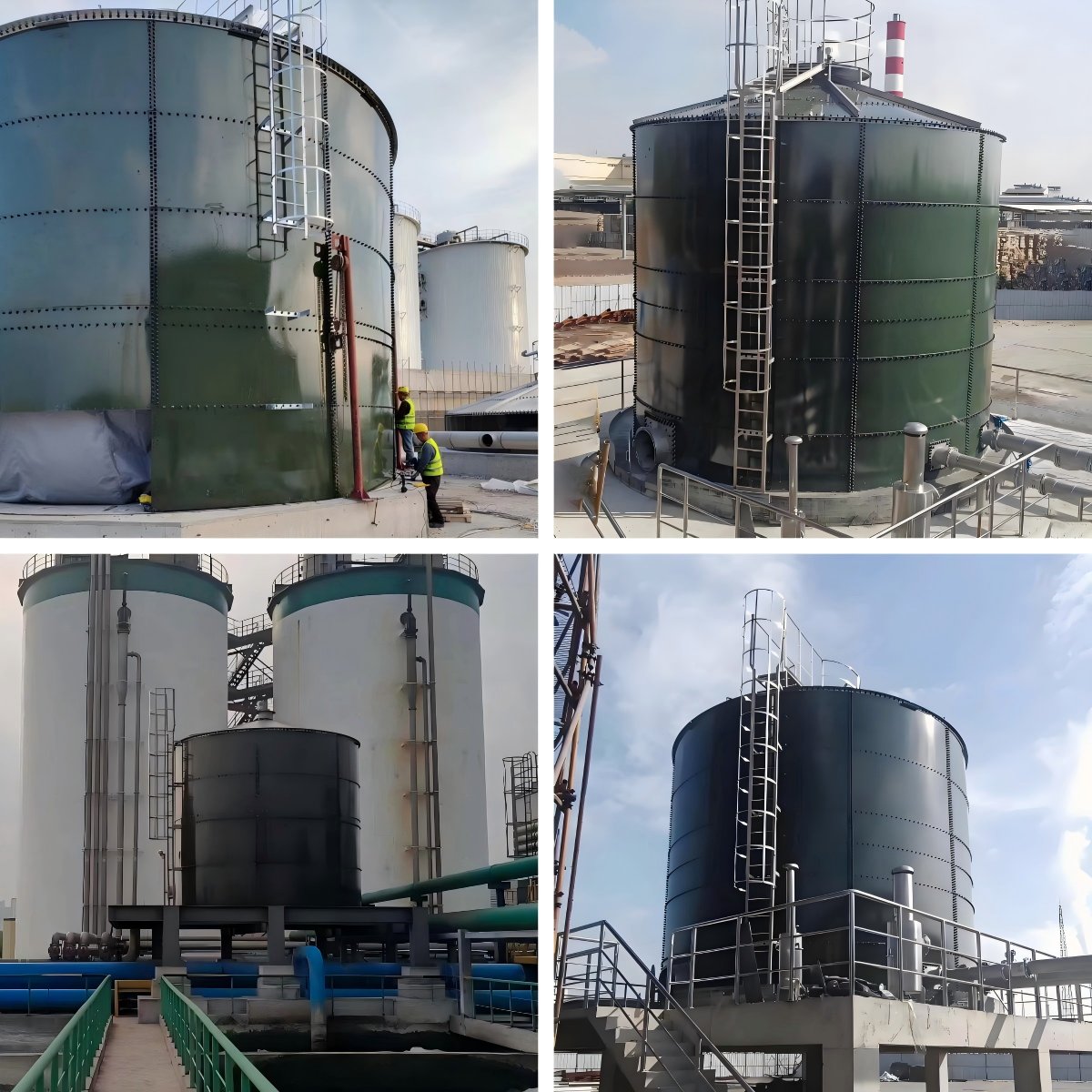 The external structure of the floating-drum gas holder consists of thetank wall, tank roof, vertical ladder, gas inlet and outlet, maintenancemanhole, and level gauge.The internal structure consists of the central column, guide rods.floating drum, gas bag, gas bag pressure strip, and drainage pipe.