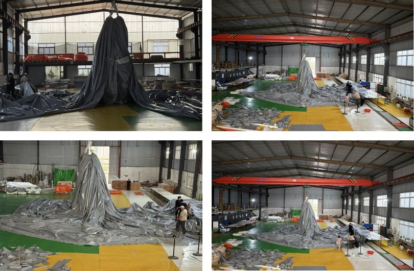 In the production workshop of Qingdao Haiyue, a 4000m³ double membrane gas holder is being manufactured in an orderly and efficient manner. As an essential component of large-scale biogas storage systems, this gas holder is made from high-strength imported membrane material and utilizes advanced heat-sealing technology, ensuring excellent airtightness and weather resistance. During production, every process is carried out in strict accordance with international standards — from membrane cutting and thermal welding to pressure testing — all precisely controlled by experienced technicians to guarantee product safety and reliability.